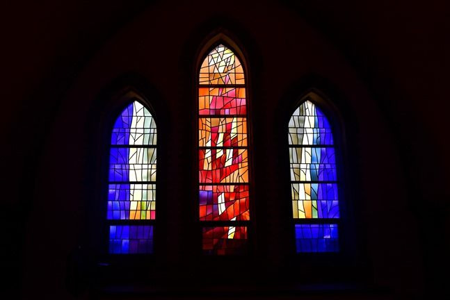 성당 제단 뒷벽 5개의 아치창은 원래 중세풍의 스테인드글라스가 설치되었으나 한국전쟁 때 없어져, 1985년 이남규 작가에 의해 제단 뒷벽 5개 창의 달드베르와 양 출입구 상부의 엔티크글라스 원형 창이 설치되었다. 달드베르창은 성체 형상으로부터 빛이 사방으로 퍼져 나가는 모습을 표현한 걸작이다. 성당 내부 나머지 창은 2015년 스위스출생의 마르크 수사에 의해 제작 설치되었는데, 성모님의 푸른 망토에서 영감을 받아 짙은 청색 계열의 유리를 과감하게 사용하였다. 2층 성가대석 창은 ‘성령과 하느님의 빛’의 이미지로 표현되었고, 성당 전체 스테인드글라스 주제는 ‘마니피캇(마리아의 노래)’이 되었다고 한다. 성당에 들어섰을 때 신비로운 푸른빛이 감도는 이유를 이제야 알겠다.