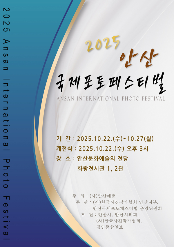 안산의 가을이 사진예술로 물든다. 사진을 통해 세계와 안산이 하나 되는 축제, ‘2025 안산국제포토페스티벌’이 오는 10월 22일부터 27일까지 안산문화예술의전당 화랑전시관 1, 2관에서 열린다. 이번 행사는 (사)안산예총이 주최하고, (사)한국사진작가협회 안산지부와 안산국제포토페스티벌 운영위원회가 주관, 그리고 안산시, 안산시의회, (사)한국사진작가협회, 경인종합일보가 후원한다.